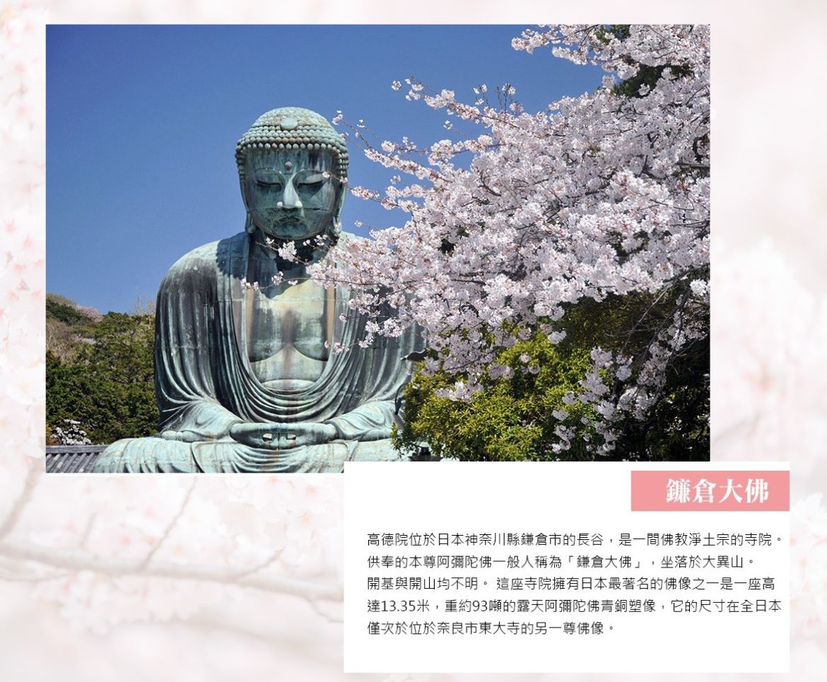 【鎌倉大佛】高德院位於日本神奈川縣鎌倉市的長谷,是一間佛教淨土宗的寺院。供奉的本尊阿彌陀佛一般人稱為「鎌倉大佛」,坐落於大異山。開基與開山均不明。 這座寺院擁有日本最著名的佛像之一—大佛—一座高達13.35米,重約93噸的露天阿彌陀佛青銅塑像,它的尺寸在全日本僅次於位於奈良市東大寺的另一尊佛像。