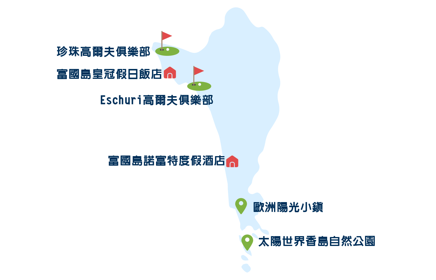 二大球場: 《珍珠高爾夫俱樂部》富國島珍珠高爾夫球場位於島嶼北部的原始林地中,環境幽靜,給您帶來沉浸在自然美景中的感受。 《Eschuri高爾夫俱樂部》位於面向大海的河口黃金地段,是一片擁有豐富野生自然土地。設計師充分利用原有的自然景觀,位玩家創造具有獨特挑戰性的絕佳體驗。 五星住宿: 富國島溫德姆大飯店&富國島皇冠假日飯店&富國島諾富特度假酒店